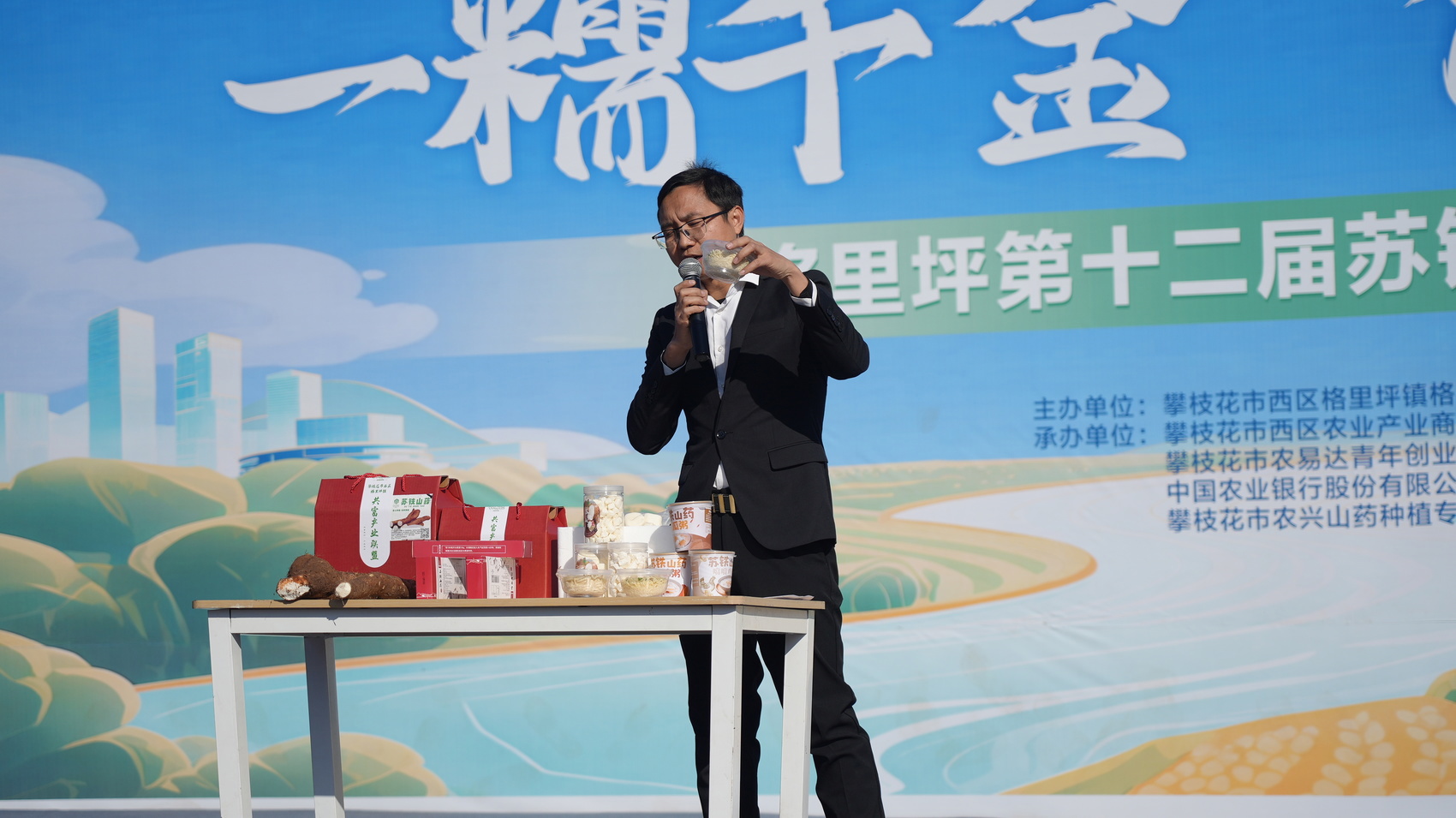 苏铁山药王评比及公益拍卖环节,工作人员按重量、品相评选出一至三等奖山药王。经过多轮竞价,山药王被现场嘉宾成功拍得,所得款项进入联盟创富基金,用于帮扶困难村民和改善村集体设施。