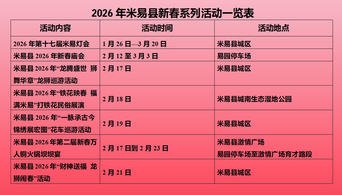 此次活动包括2026年第十七届米易灯会、2026年新春庙会、“龙腾盛世·狮舞华章”龙狮巡游、“铁花映春 福满米易”打铁花民俗展演、“一脉承古今 锦绣展宏图”花车巡游、2026年第二届新春万人铜火锅坝坝宴等活动。