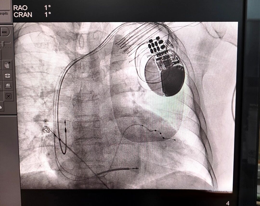 据了解,本次手术的患者梁某曾接受缺血性心肌病冠状动脉介入治疗,近期心功能严重减退,因持续性胸痛两小时就诊入院,经检查心脏射血分数(EF值)低于35%,面临较高的心源性猝死风险,病情危急。面对这一复杂病例,该科室核心团队经多轮研判与系统评估,最终决定为患者施行新一代NG4CRTD植入术。