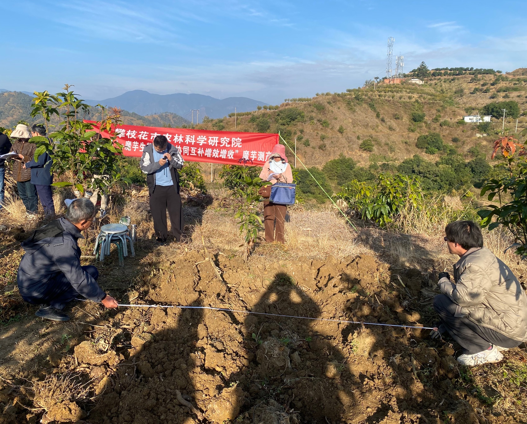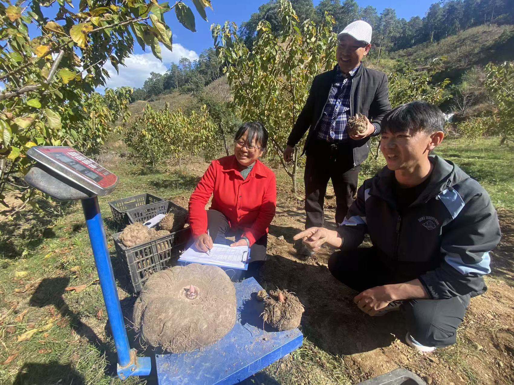 啊喇乡起查喇村樱桃地,专家和种植户正在对刚挖出的魔芋称重。吴晓龙 摄
