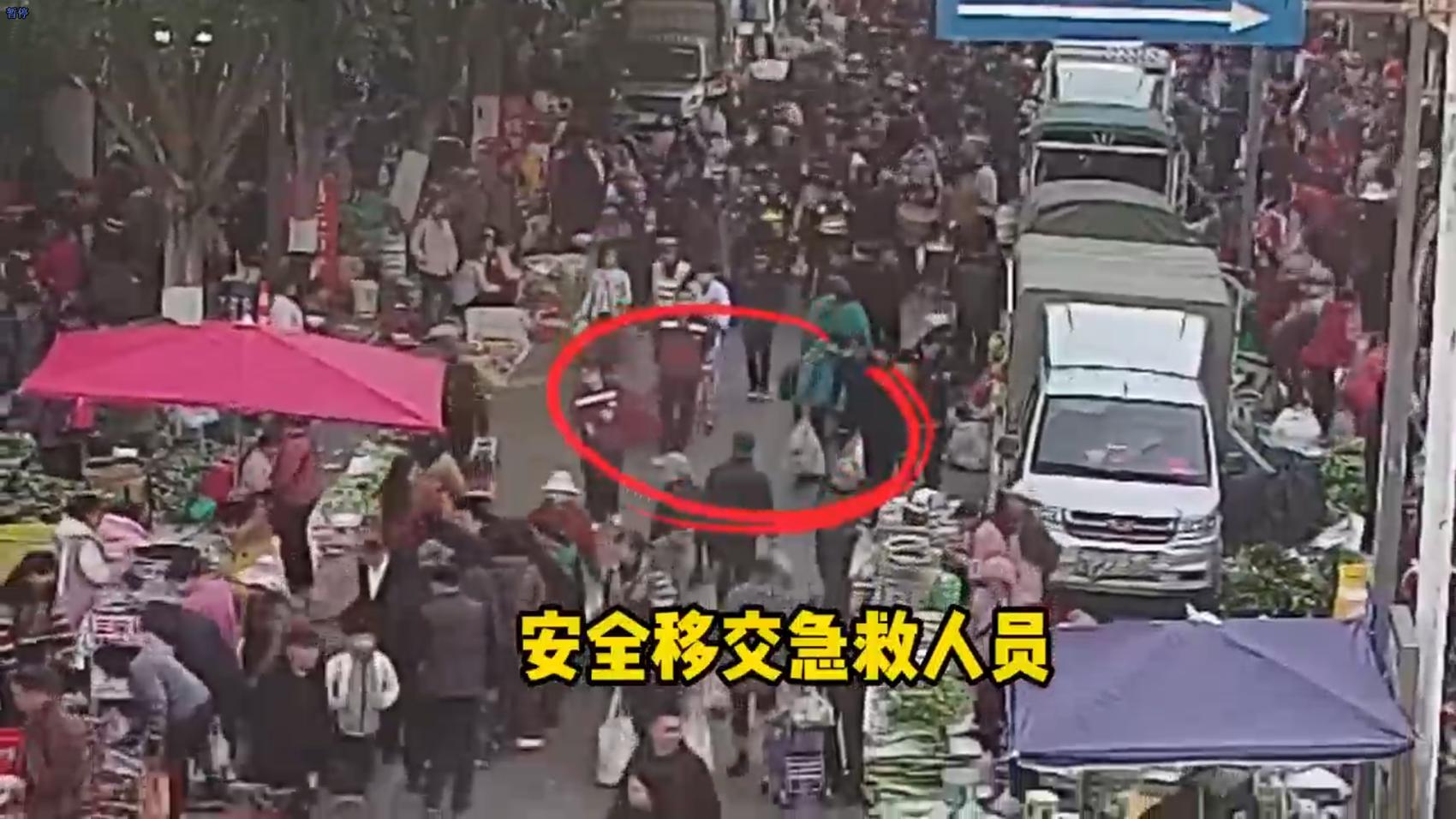 “请大家让一让!有病人需要急救!”朱敏则一边大声呼喊,一边在前方开辟通道。赶集的群众见状纷纷主动避让,不少摊主也迅速挪动商品,为生命让出一条绿色通道。