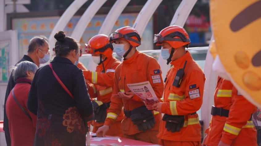 春节期间,消防员们开展防火专项行动,向过往市民游客发放防火宣传单。