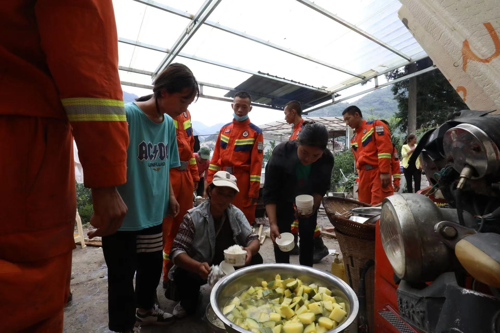 当了解到队员们已经两天没有吃过热饭菜,村民们立马坐不住了,自发组织紧急备菜做饭,为队员准备餐食。