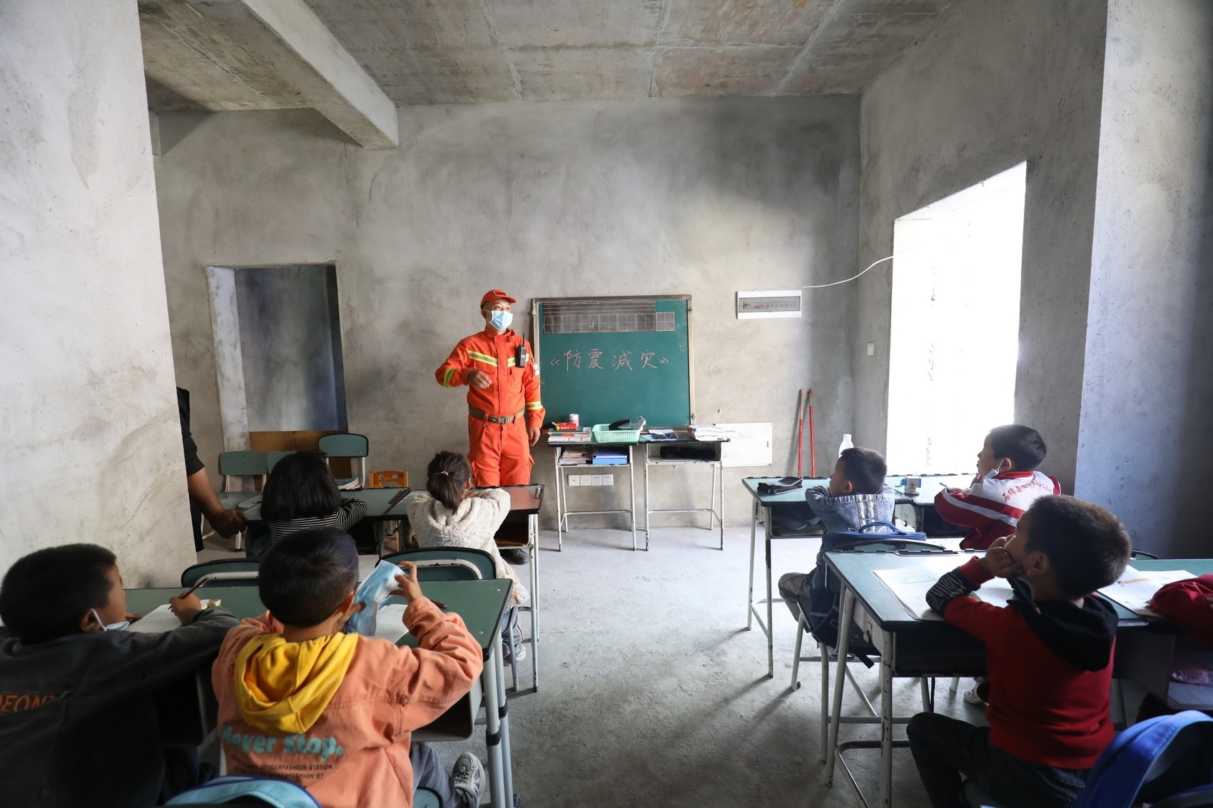为了让学生们能安心地开启学习生活,救援人员及时从教室里将学生的书包、课本以及生活物品搬运出来,同时还在爱国村一安置楼房内搭建了临时教室。