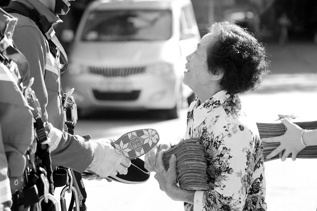 唐明现的女儿张青将布鞋及鞋垫送到消防员手中。张仟林 摄