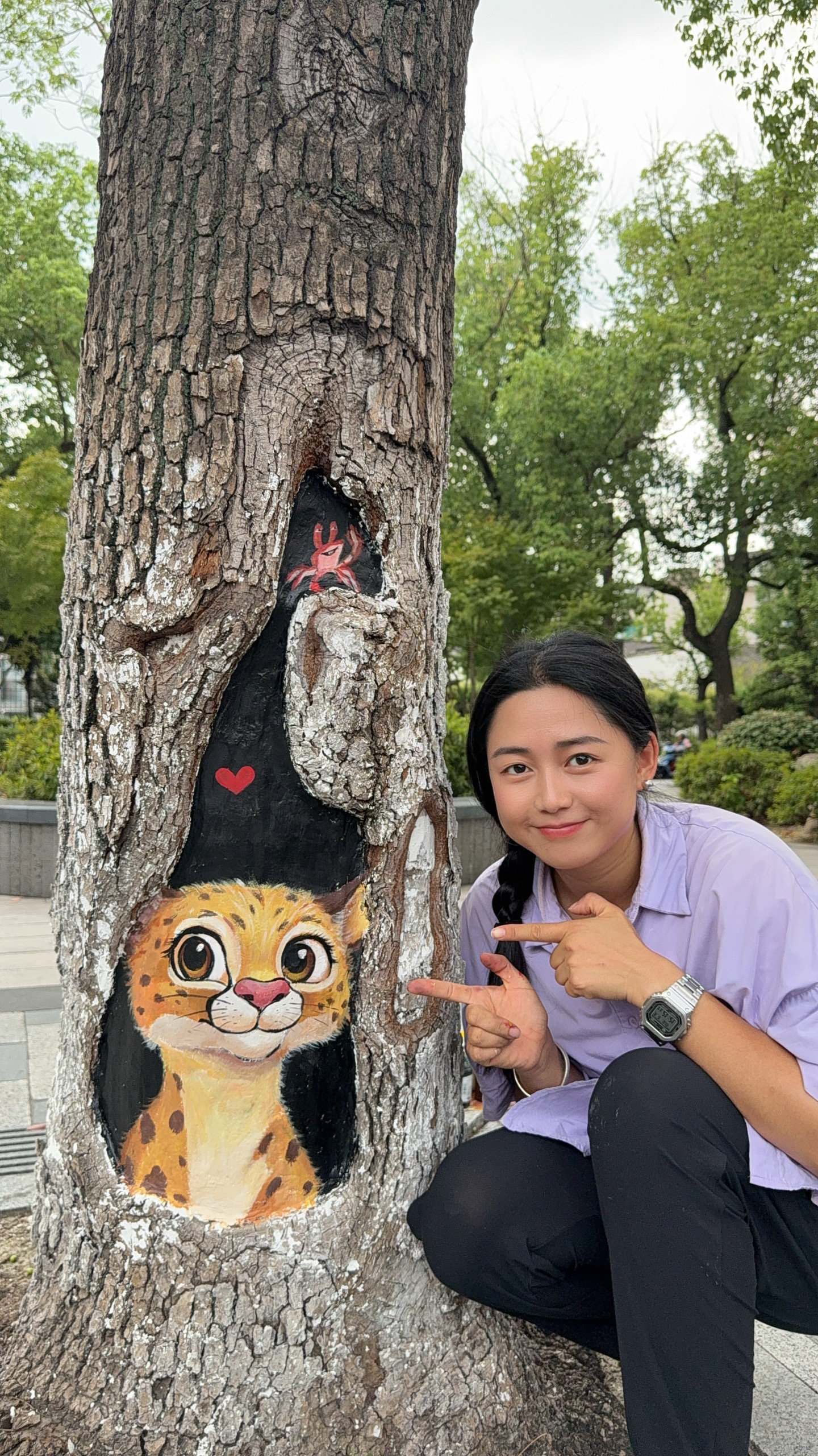量洞定制、一洞一景,她让小猫“躺”进澡盆、让小象“探”出长鼻、让熊猫“托”腮打盹……“动物与森林天然相连,树洞画就是想让行人在钢筋水泥里,突然收到一份童话礼物。”