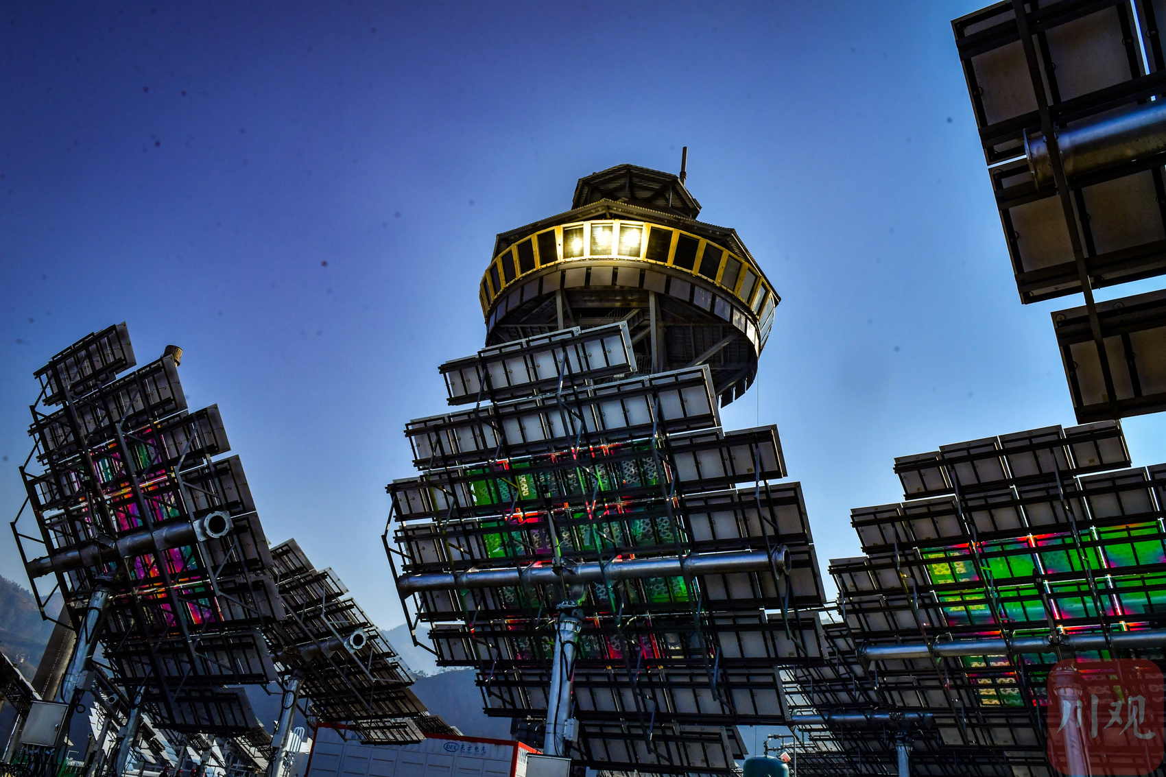 走进基地,聚光反射塔在夕阳下光斑闪耀,仿佛置身科幻场景。而支撑这一场景的,是攀枝花年均2700小时左右的充足日照,这为“光解水制氢”提供了天然的能源基础。
