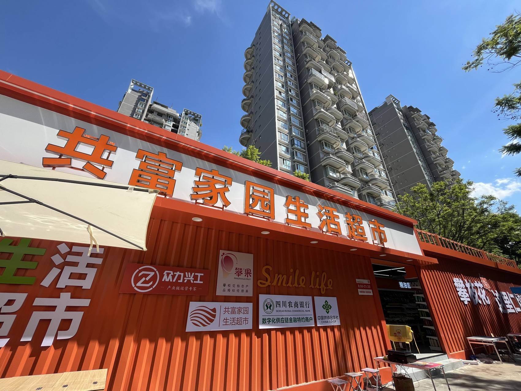 9月3日,攀枝花市仁和区烟火仁和国潮风情街的集装箱建筑群里格外热闹,全市第7家攀果·共富家园生活超市在这里正式开门迎客。统一的集装箱风格让这家超市与街区景致浑然一体,刚开业便吸引了不少居民驻足选购。