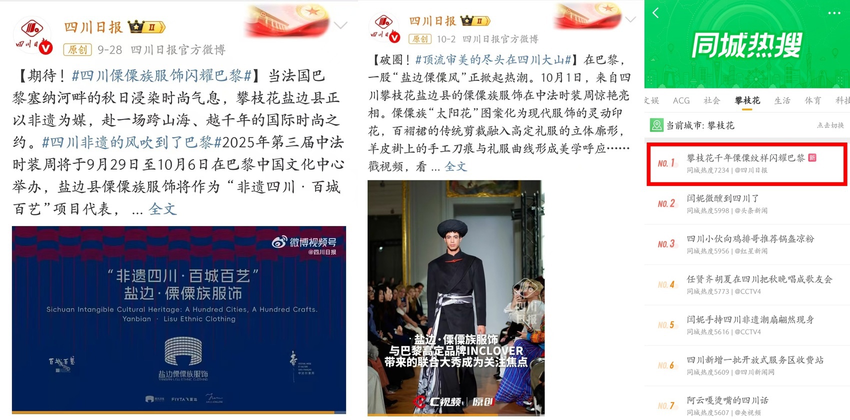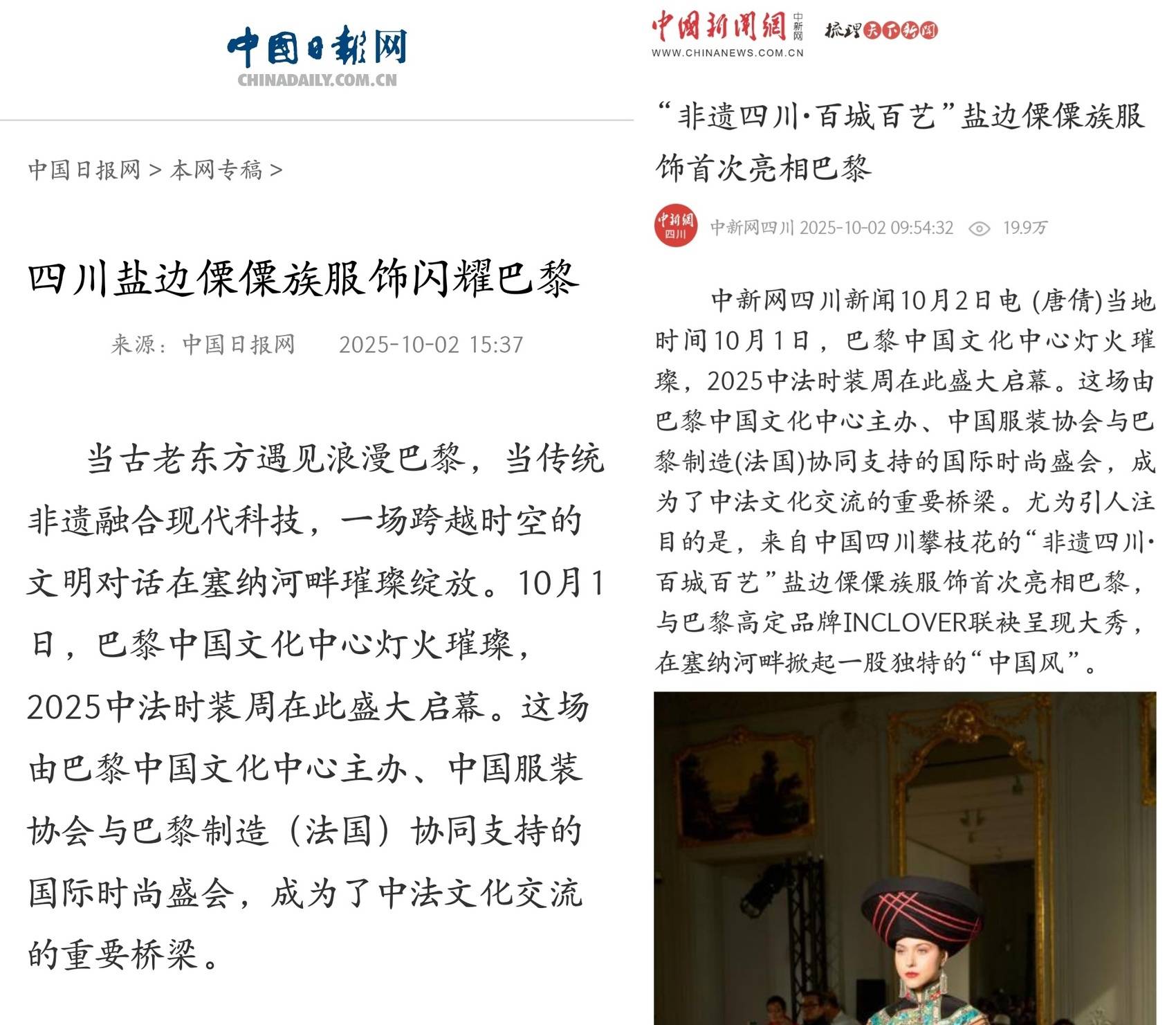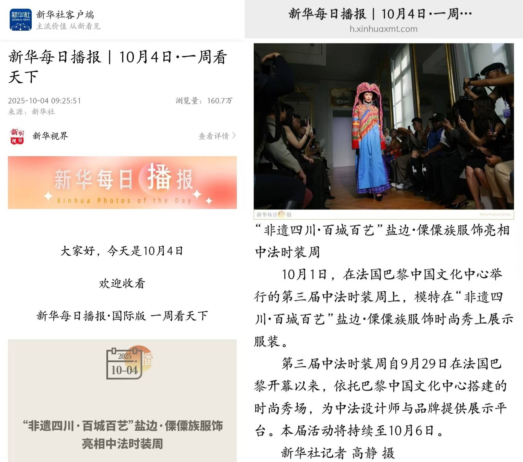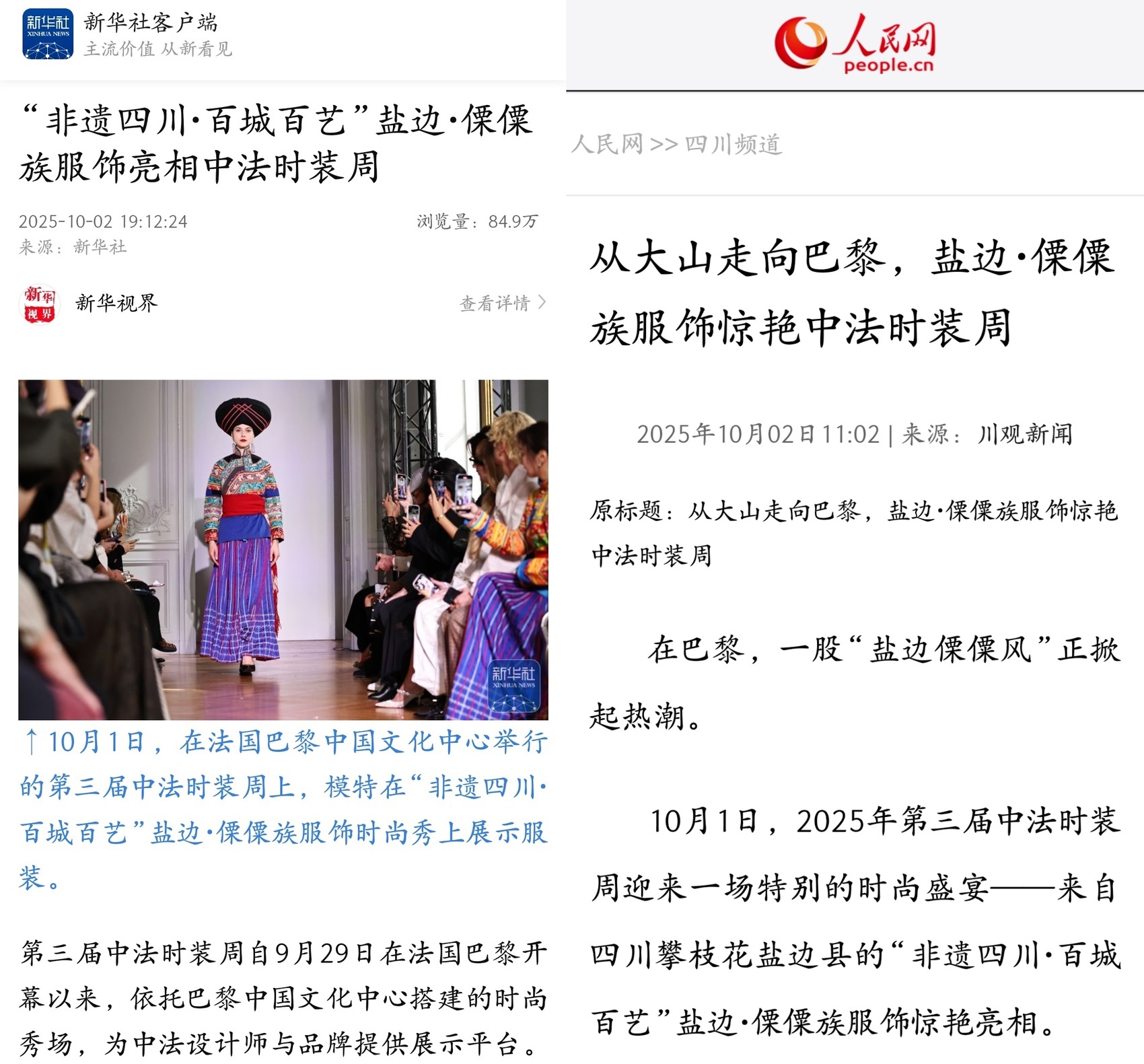 此外,10月3日登上《四川日报》头版,10月4日由新华社收录到《新华每日播报·国际版 一周看天下》。在三方平台上,由四川日报主持的微博话题【期待!#四川傈僳族服饰闪耀巴黎#】【破圈!#顶流审美的尽头在四川大山#】热度攀升,登上同城热搜第一。同时,川观新闻特派川观拍客赴法国拍摄,凭借前期创意策划和现场细节采访,对场内场外、线上线下、嘉宾观众进行多篇原创报道,引发网友热评。