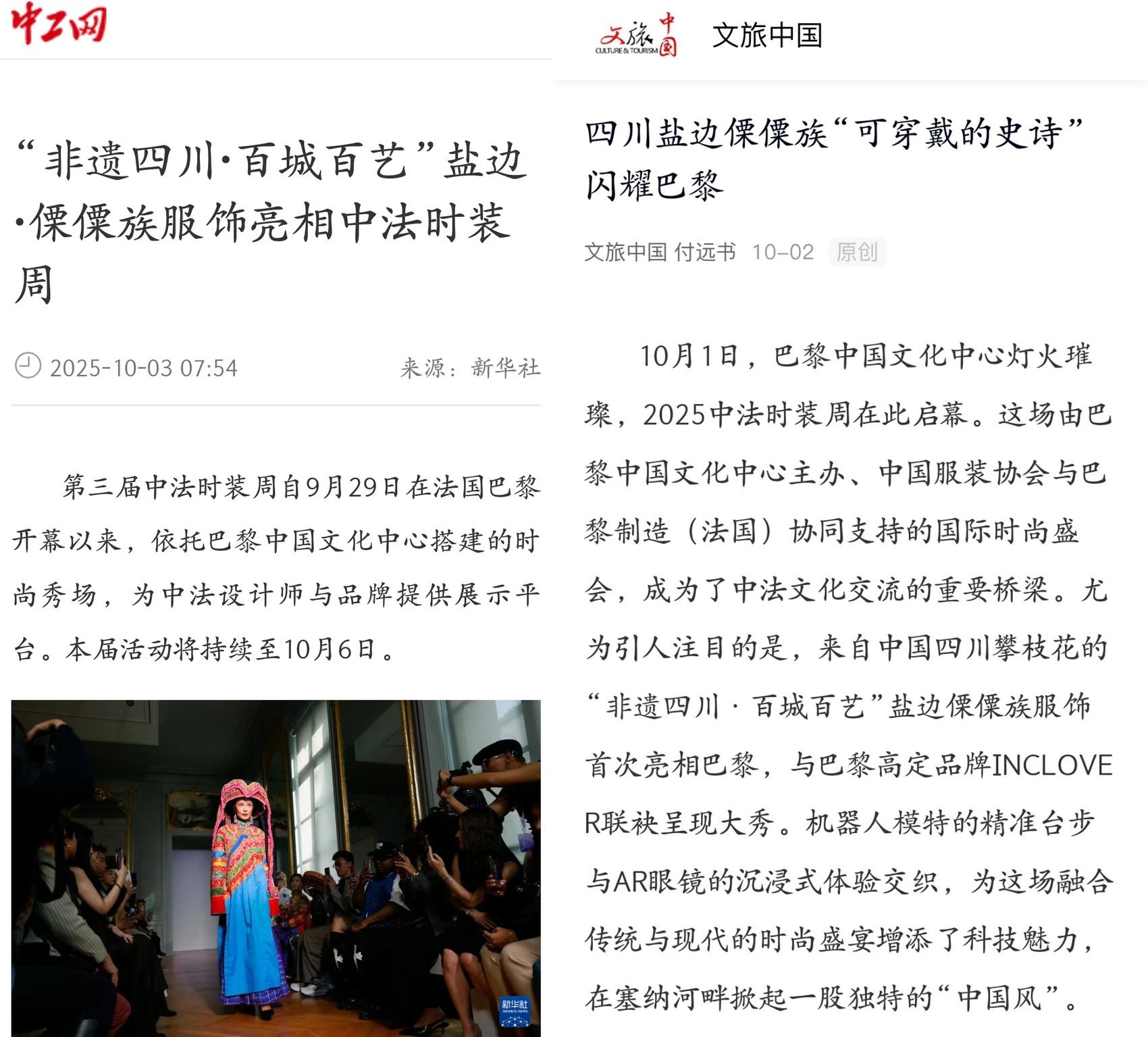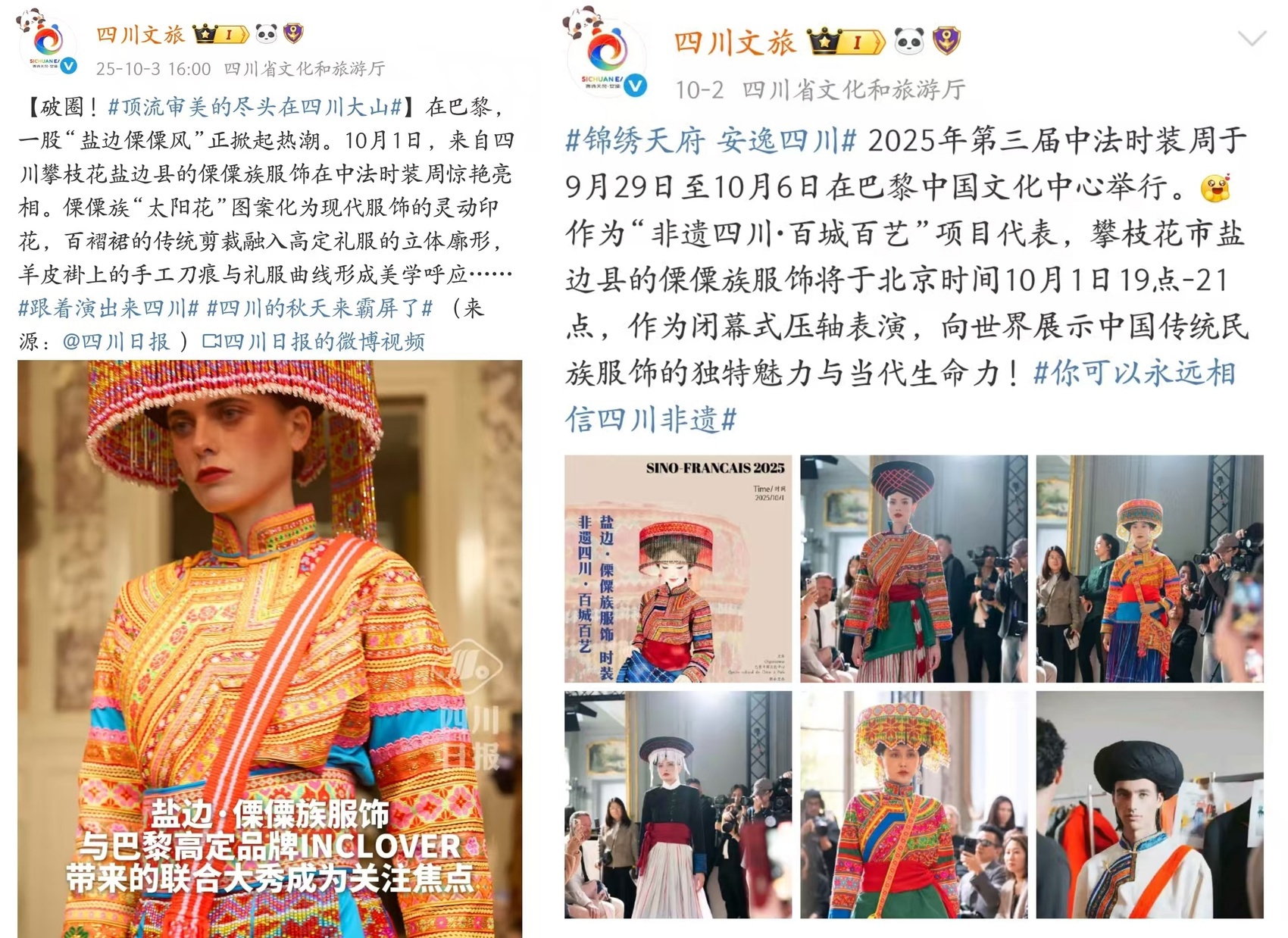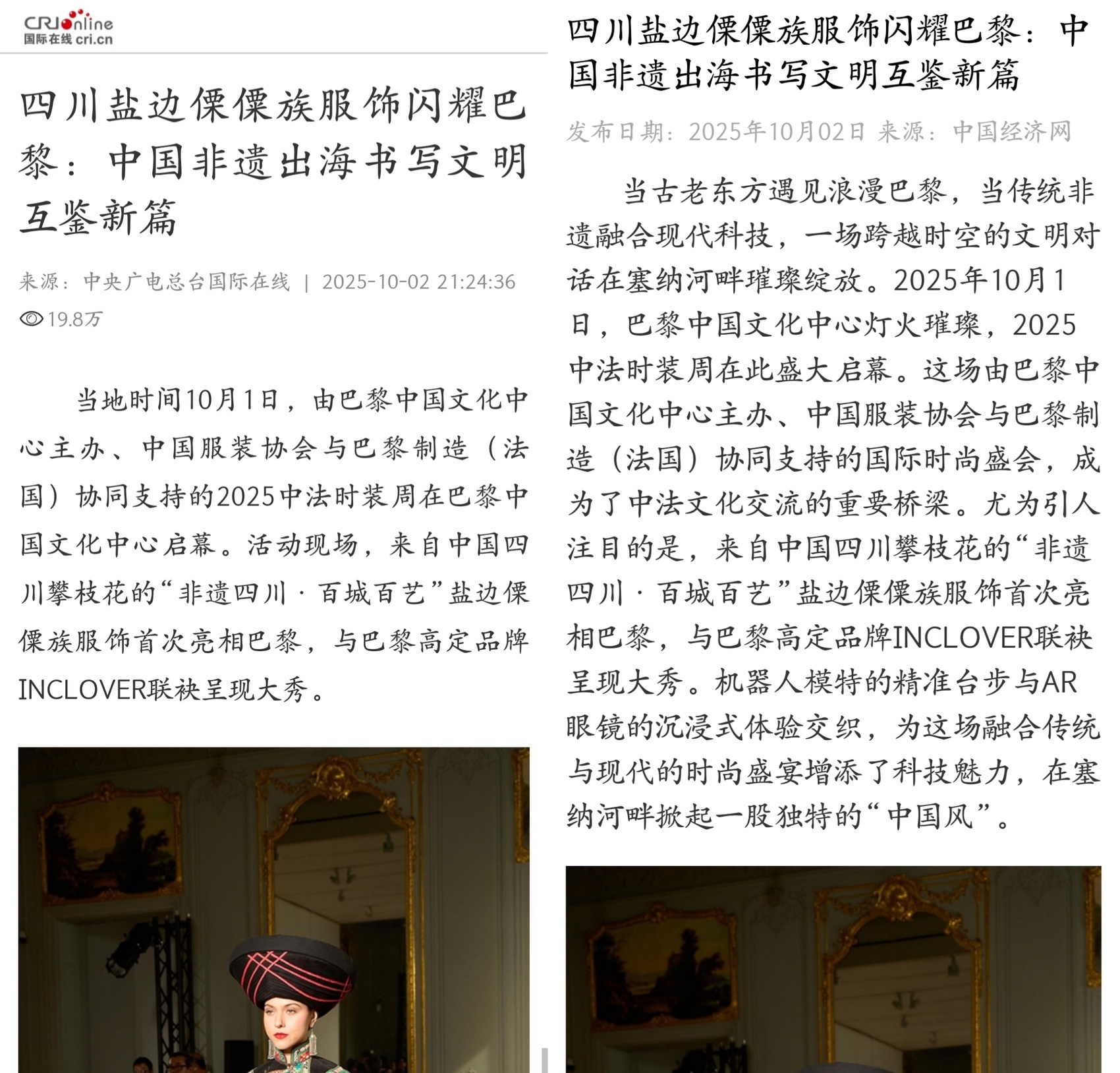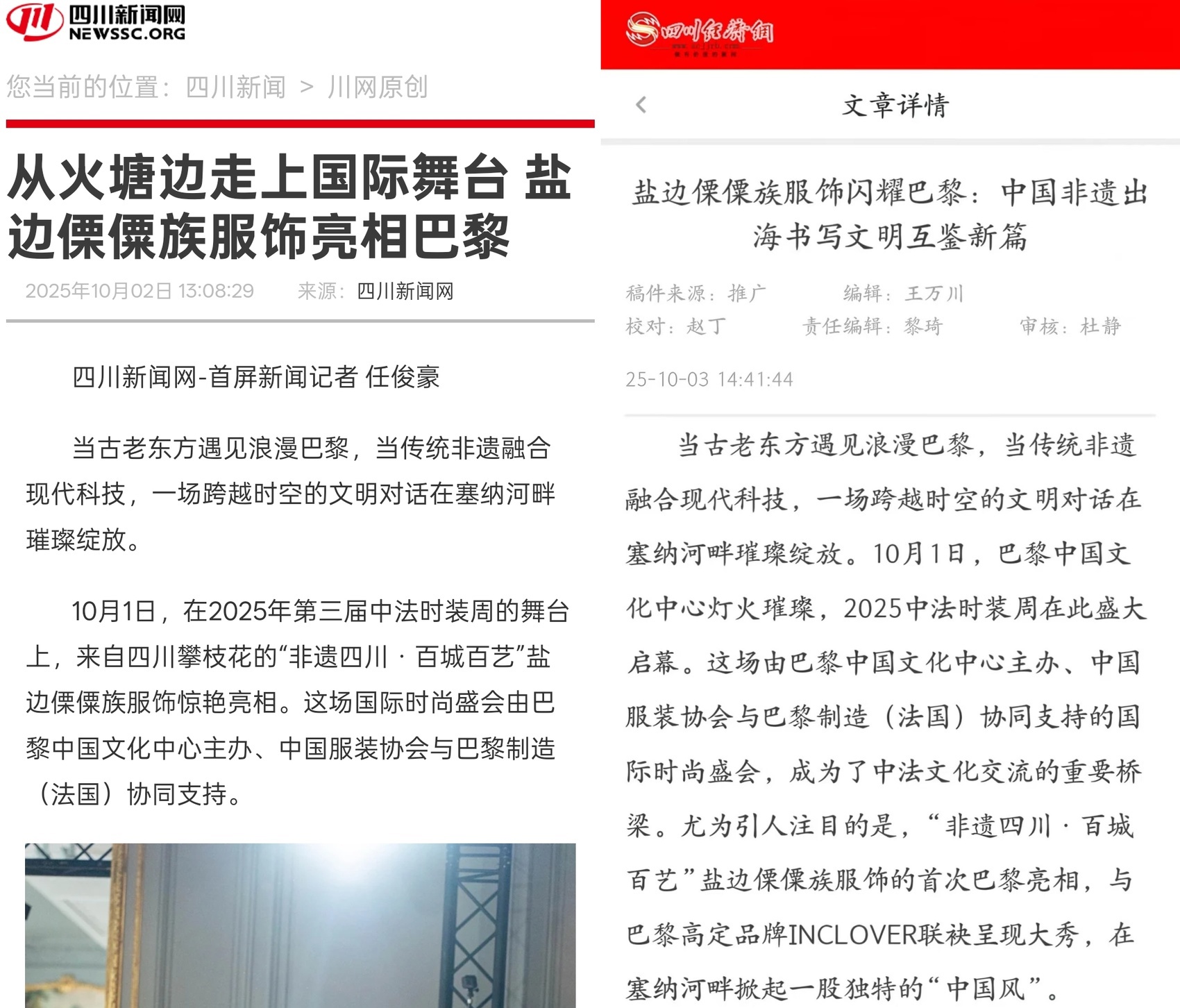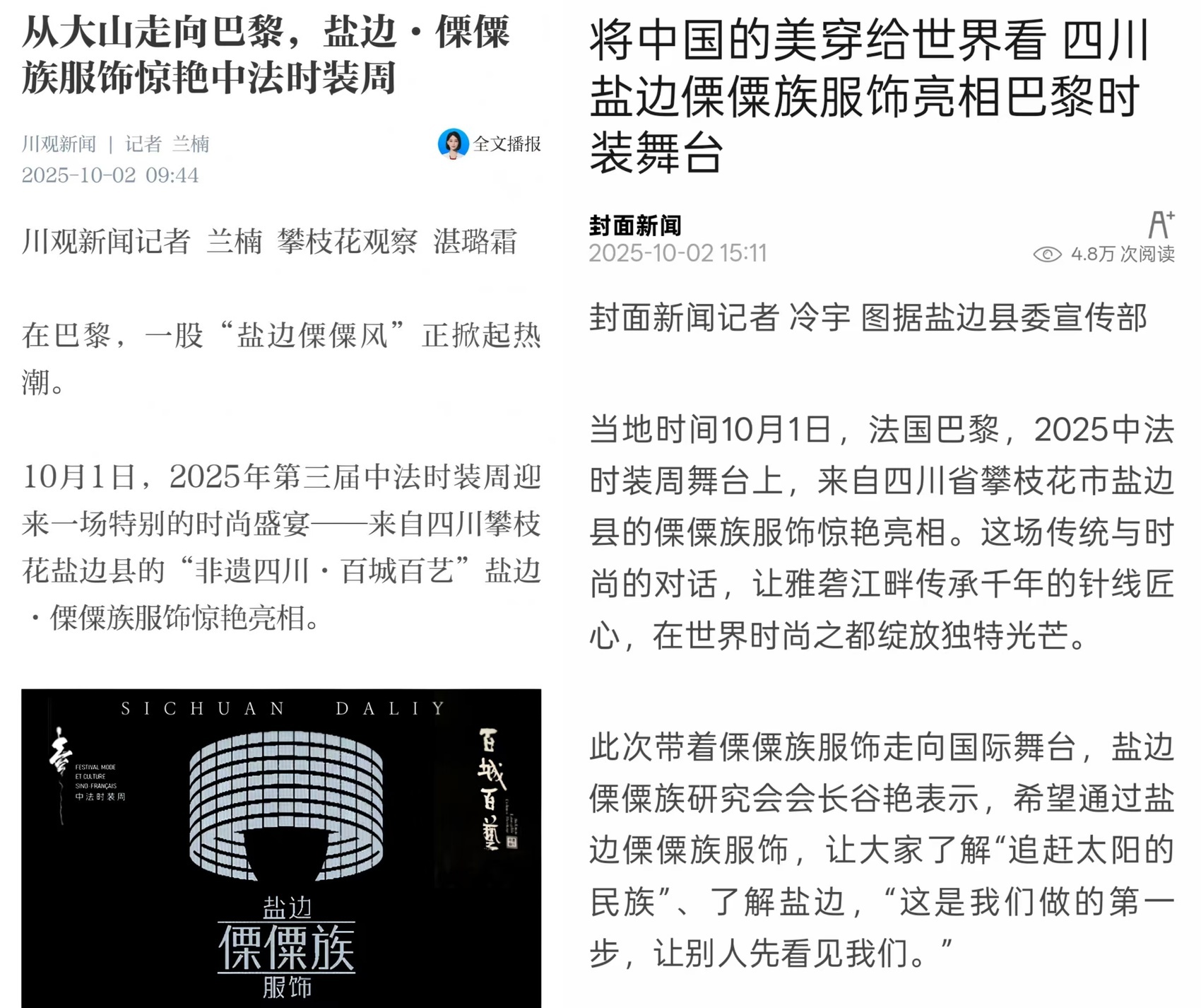 此外,10月3日登上《四川日报》头版,10月4日由新华社收录到《新华每日播报·国际版 一周看天下》。在三方平台上,由四川日报主持的微博话题【期待!#四川傈僳族服饰闪耀巴黎#】【破圈!#顶流审美的尽头在四川大山#】热度攀升,登上同城热搜第一。同时,川观新闻特派川观拍客赴法国拍摄,凭借前期创意策划和现场细节采访,对场内场外、线上线下、嘉宾观众进行多篇原创报道,引发网友热评。