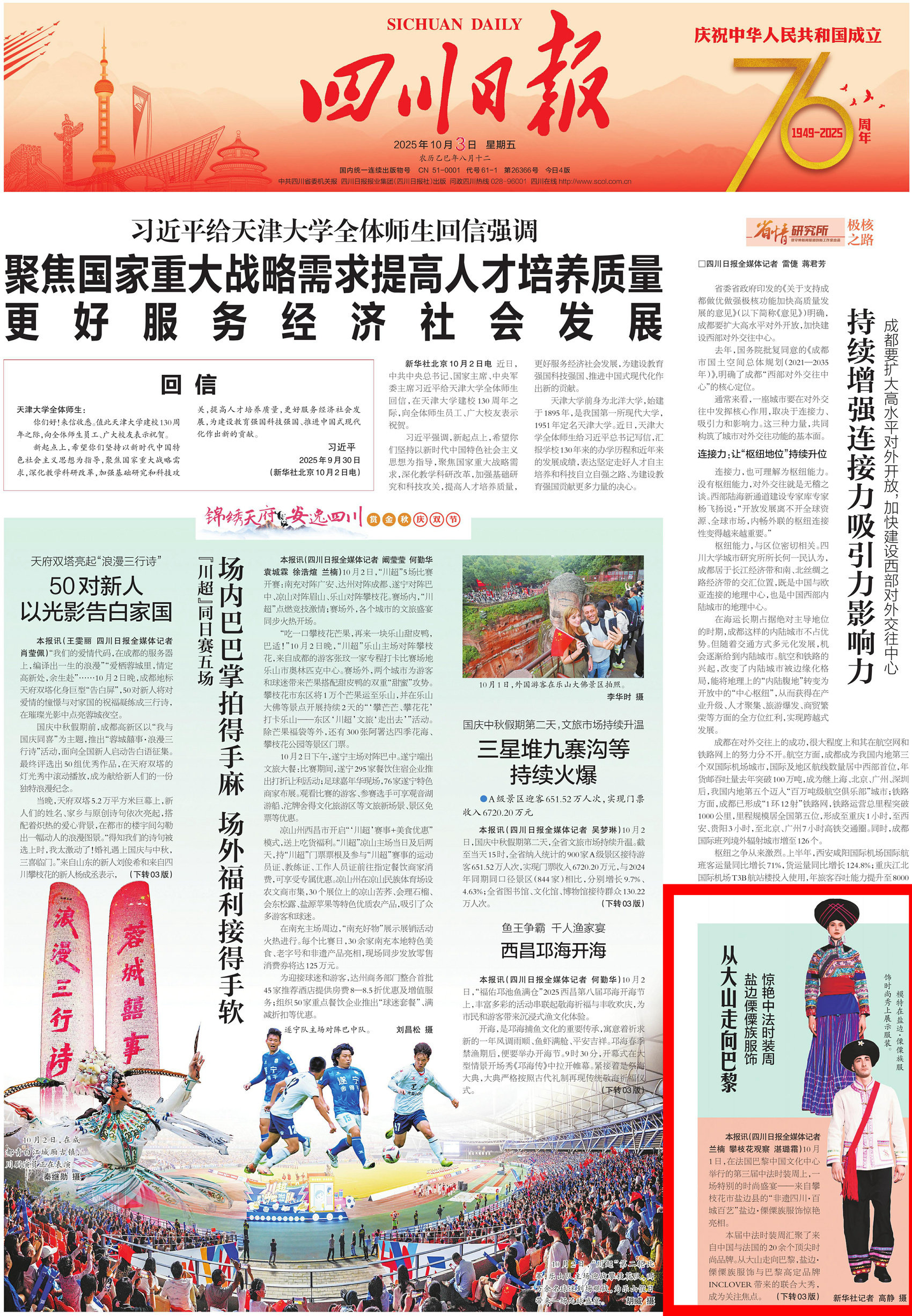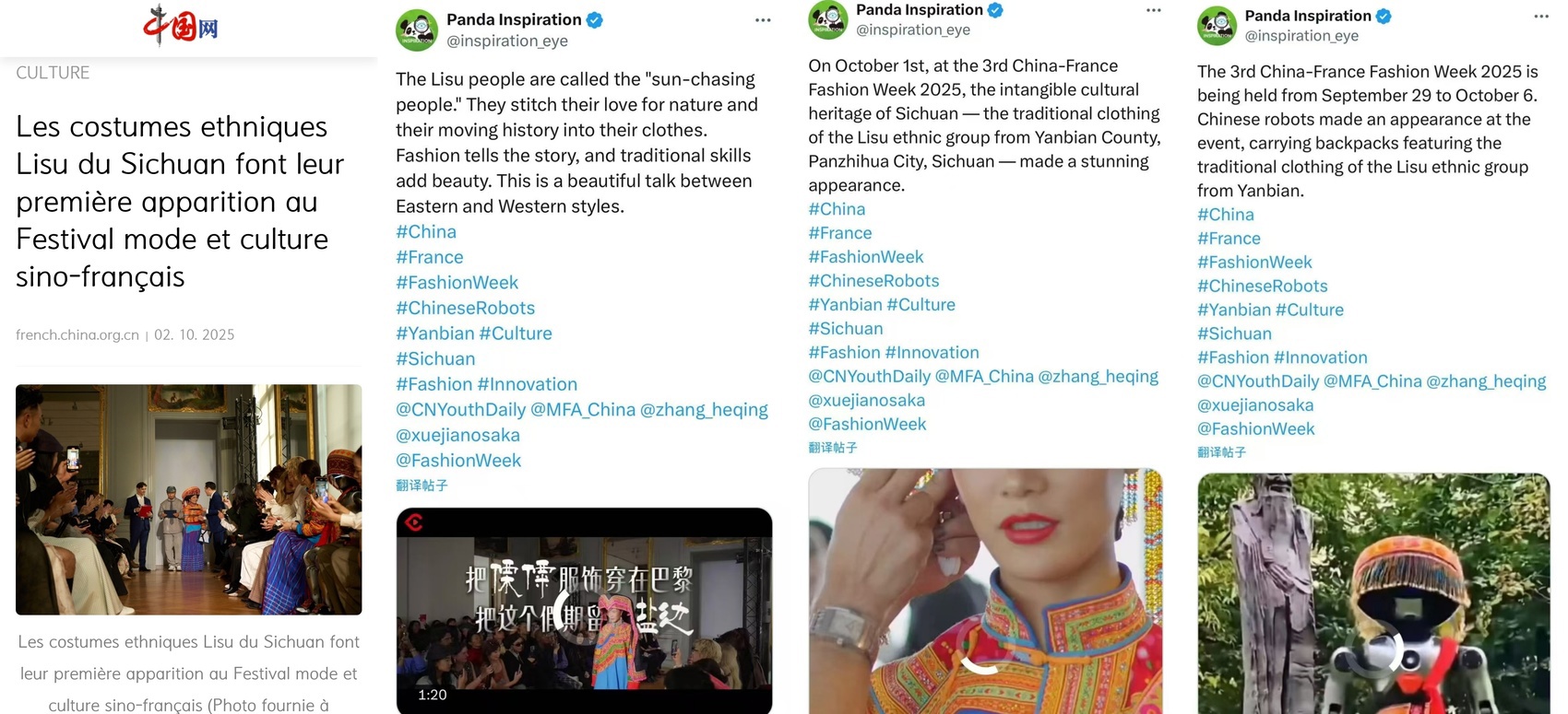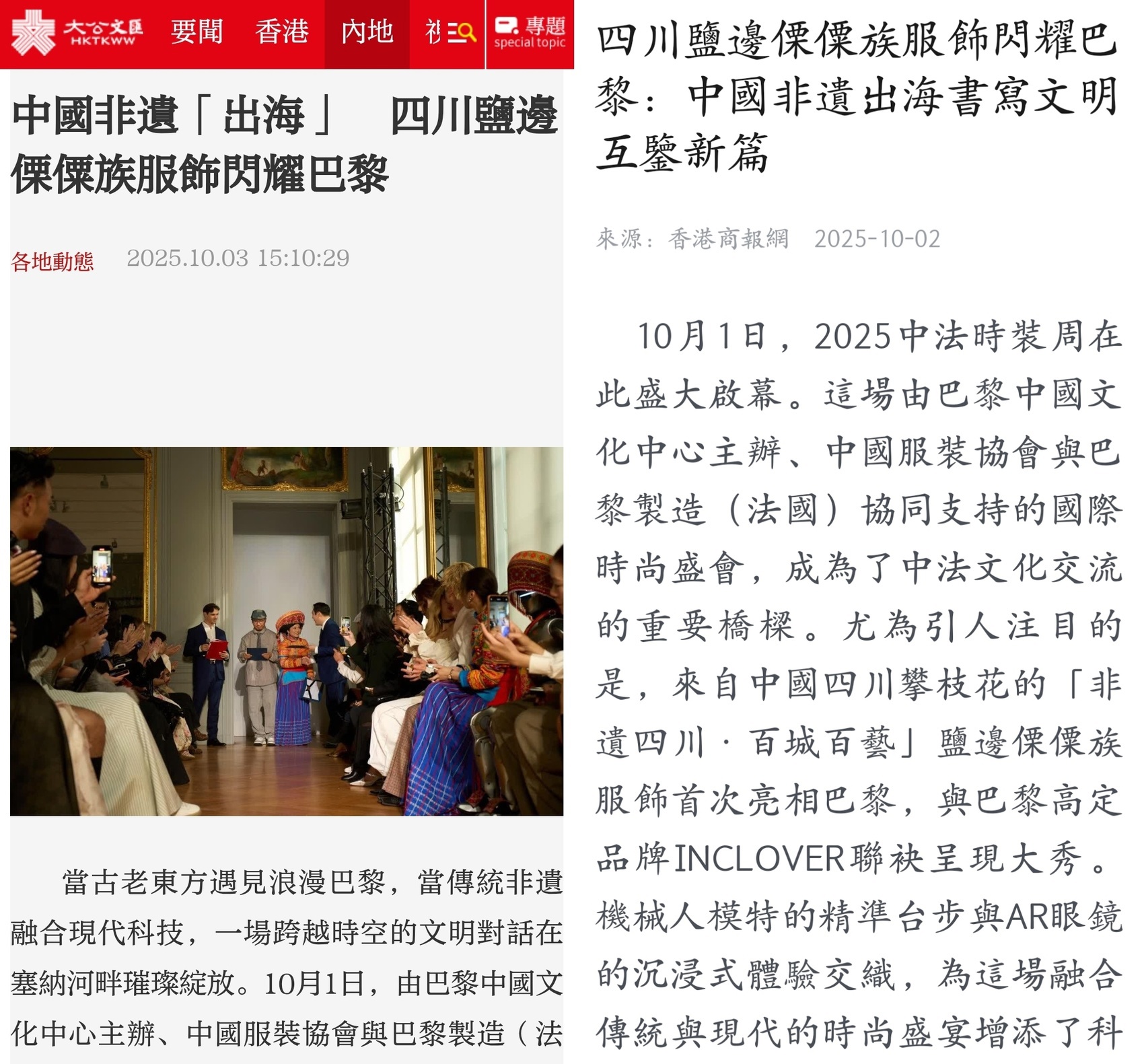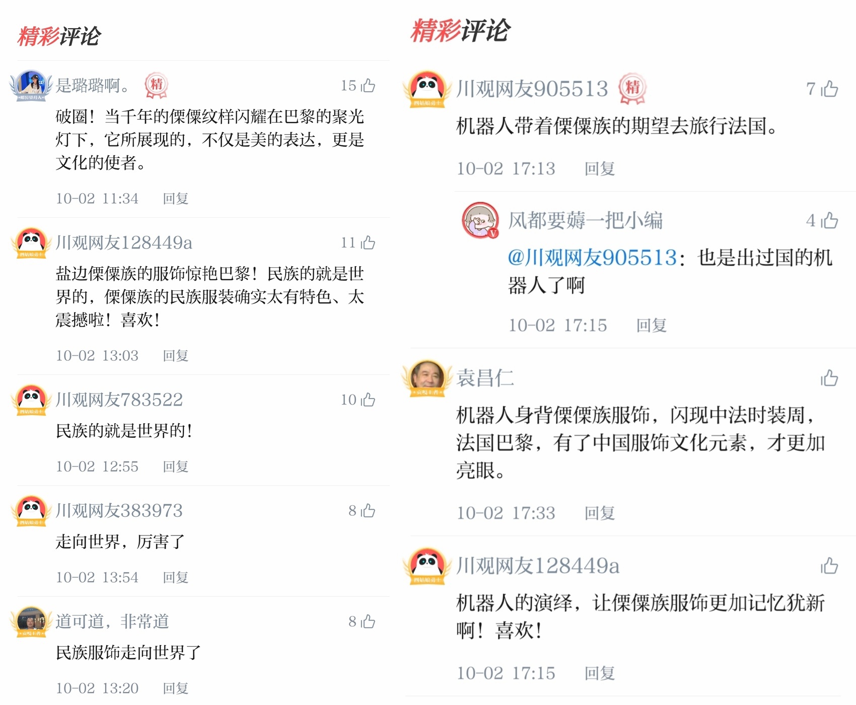 此外,10月3日登上《四川日报》头版,10月4日由新华社收录到《新华每日播报·国际版 一周看天下》。在三方平台上,由四川日报主持的微博话题【期待!#四川傈僳族服饰闪耀巴黎#】【破圈!#顶流审美的尽头在四川大山#】热度攀升,登上同城热搜第一。同时,川观新闻特派川观拍客赴法国拍摄,凭借前期创意策划和现场细节采访,对场内场外、线上线下、嘉宾观众进行多篇原创报道,引发网友热评。