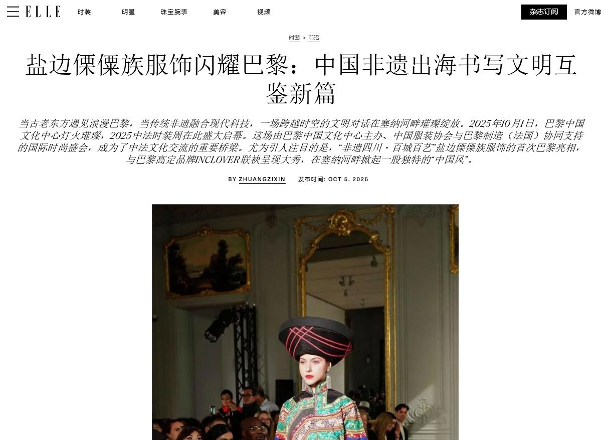 值得一提的是,本次中法时装周,盐边傈僳族服饰登上了法国时尚杂志《ELLE》版面,以民族瑰宝之姿赢得全球时尚瞩目。