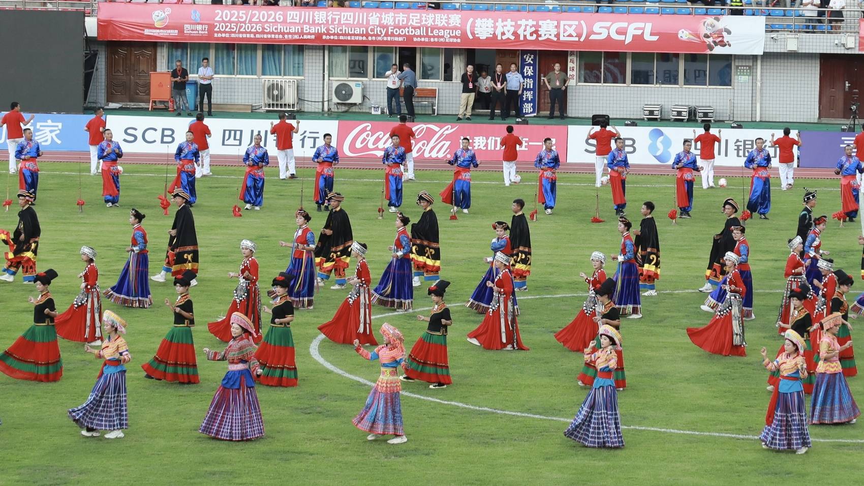 攀枝花与雅安的比赛开场前,身着盐边傈僳族服饰的舞者,用一曲《笮山锅庄》点燃了现场近2万名球迷的热情。记者注意到,当天的开场表演中包含9项非遗的展示。