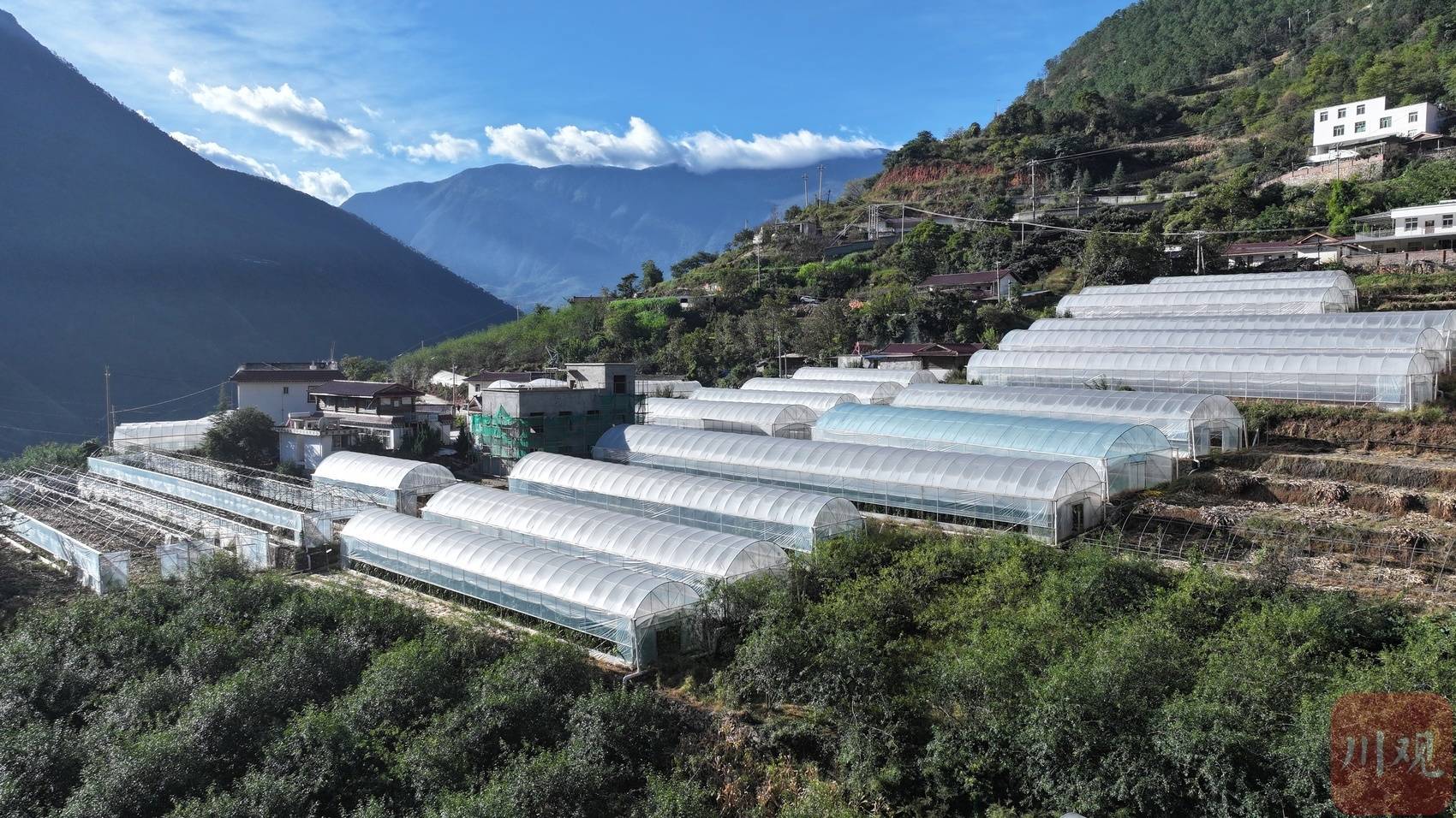 11月8日,木里县乔瓦镇簸箕箩村,攀枝花援建的农业智慧大棚整齐排列