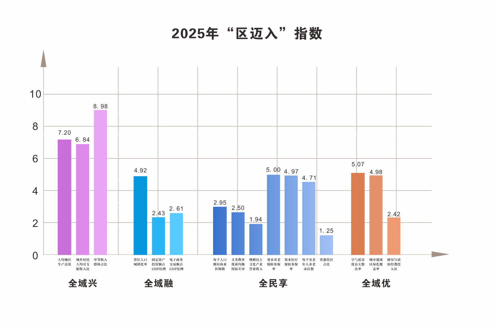 “区迈入”指数从81.01提升至93.57,“全域兴”“全域优”距2027年工作目标的达成率均超90%,“全民享”“全域融”达成率分别为80.53%、82.98%,反映出公共服务与基本保障虽全域覆盖,但共享质量与均衡程度仍有差距。